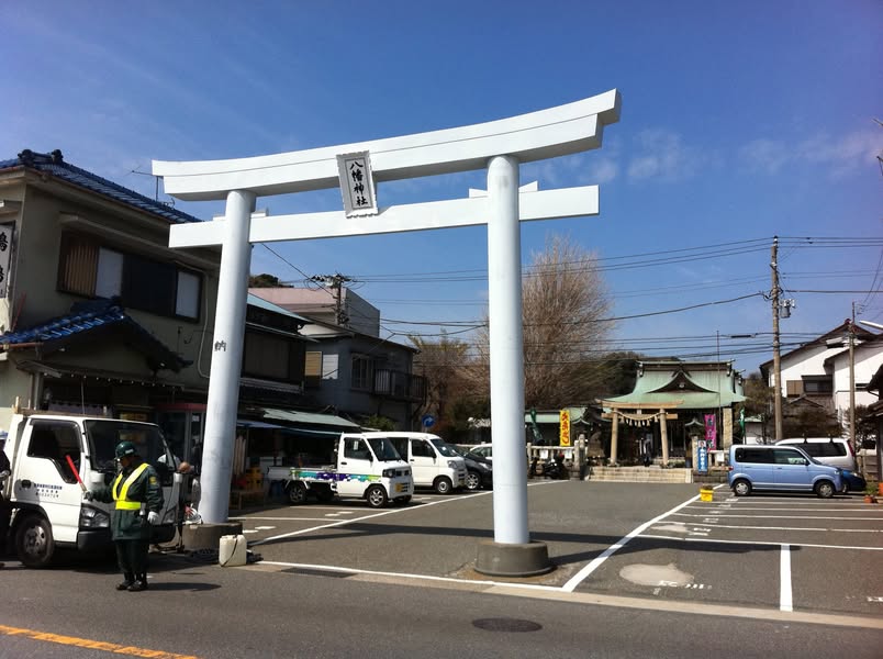 駐車場から歩いて数分のところに、八幡神社がある。鳥居の目の前は海で、鳥居の横には、『鴨鶴』というタコの釜めしが旨い料理屋がある。ここで出す魚は鴨居漁港で上がったものを出すので、水揚げが悪いとお店が閉まる。家族5~7人くらいで厨房をまかなっていて、活気のあるお店である。