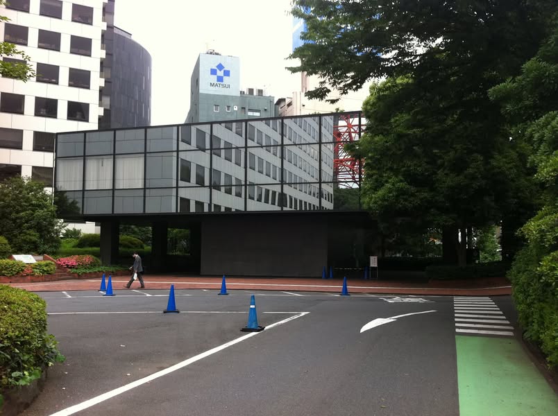 六本木五丁目交差点を右折すると正面に東京タワーが見える。飯倉片町交差点を過ぎ、左に外務省の外交史料館、右にロシア大使館を見ながら、飯倉交差点を過ぎたところ。東京タワーの真下辺り。黒いガラス張りの低層建築物が目に入る。