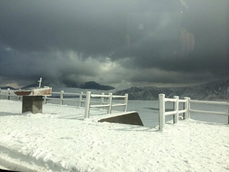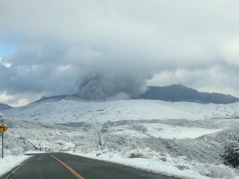 1枚目は灰色の地肌のようなものが降灰で、その上から雪が積もっています。噴煙が出ているのは中岳です。