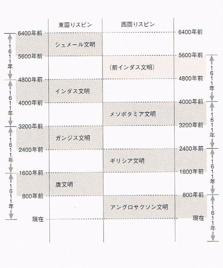 添付の画像にあるように、世界文明の発祥はシュメールとされているが、それを起点として、地球を東廻り、西廻りにそれぞれ、22.5度づつ1611年毎にづれた場所が文明の中心点となるというのである。ただし、西廻り、東廻り交互に中心となるので、1611年の二分の一、およそ800年周期で文明は西から東、東から西へと交互に移動するというのである。