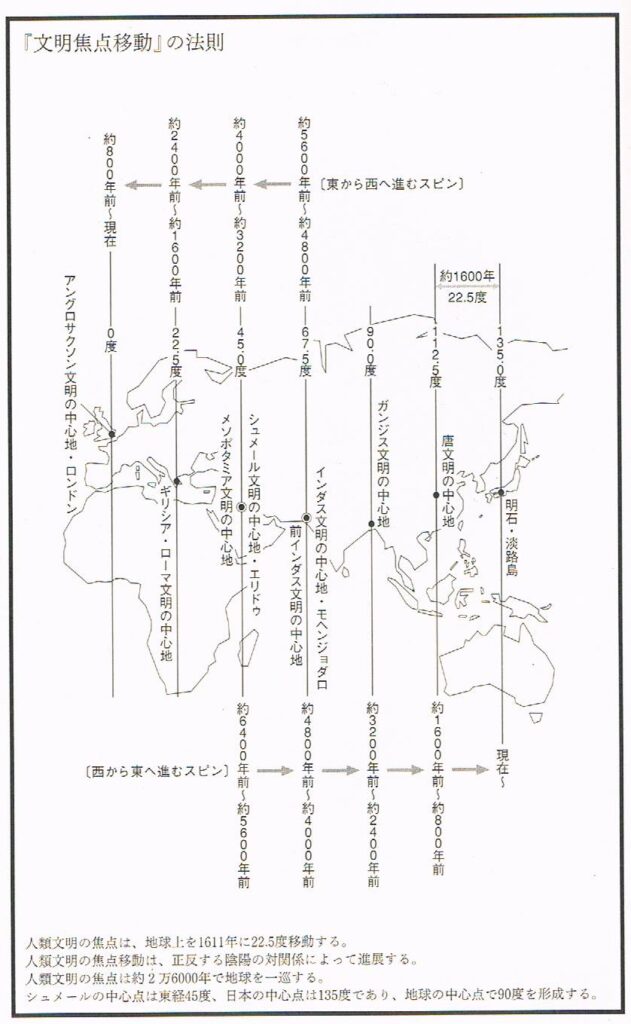 添付の画像にあるように、世界文明の発祥はシュメールとされているが、それを起点として、地球を東廻り、西廻りにそれぞれ、22.5度づつ1611年毎にづれた場所が文明の中心点となるというのである。ただし、西廻り、東廻り交互に中心となるので、1611年の二分の一、およそ800年周期で文明は西から東、東から西へと交互に移動するというのである。