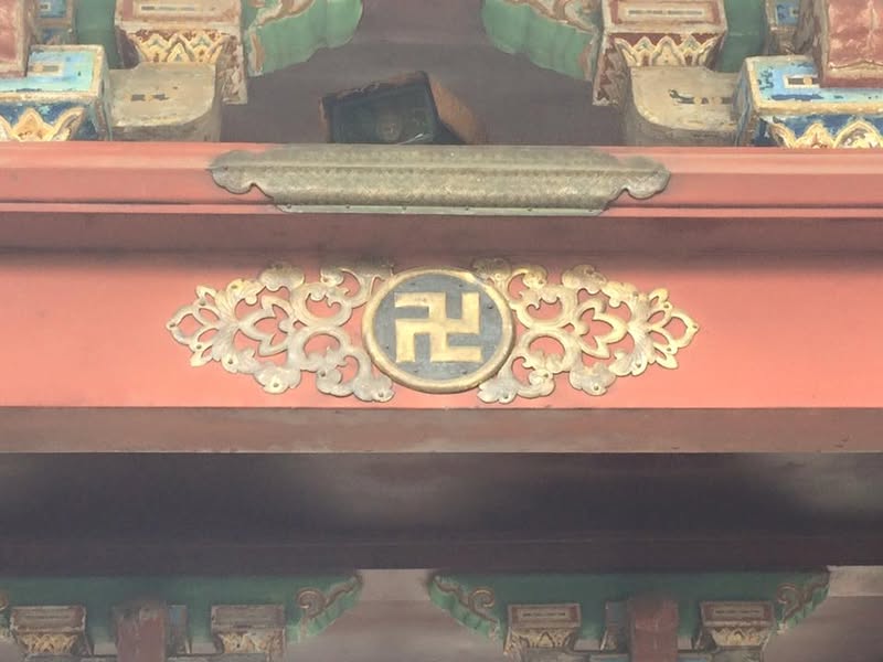 神仏習合様式を今に残す珍しい社殿の紋章には恐らく真言宗が管理していたであろうことを示す、卍型である。