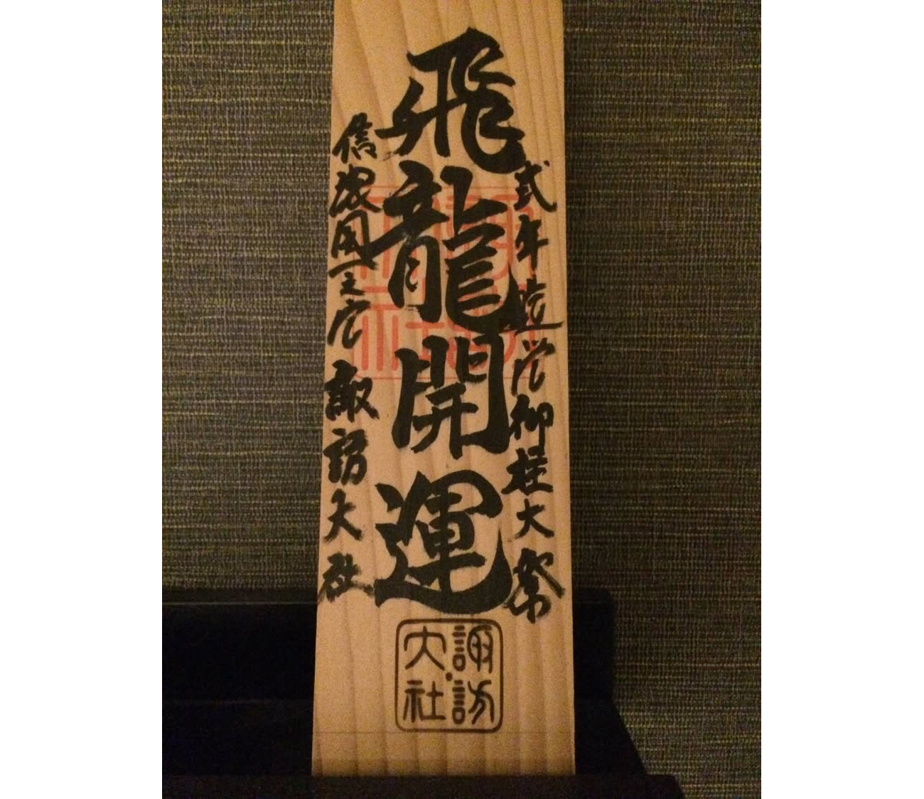 写真は、前回の御柱祭の際に役目を終えた柱の御下がりで作られた木札である。