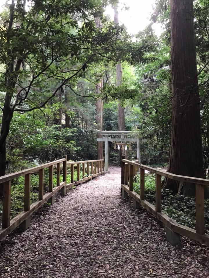 神殿前の湾内から五つほどの鳥居が連なり美しい光景を見せる。干潮時には厳島神社のように海上の鳥居まで足を運ぶことができる。