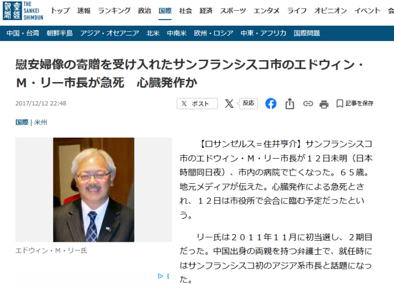 Share Facebook Twitter LinkedIn Pinterest Email バックグラウンドのないただの死なのか 米国の国益にそぐわないという理由からか 中国政府との黒い繋がりが明るみになりそうになったことによるのか いずれにしても随分なタイミング 慰安婦像の寄贈を受け入れたサンフランシスコ市のエドウィン・M・リー市長が急死 心臓発作か(産経新聞)