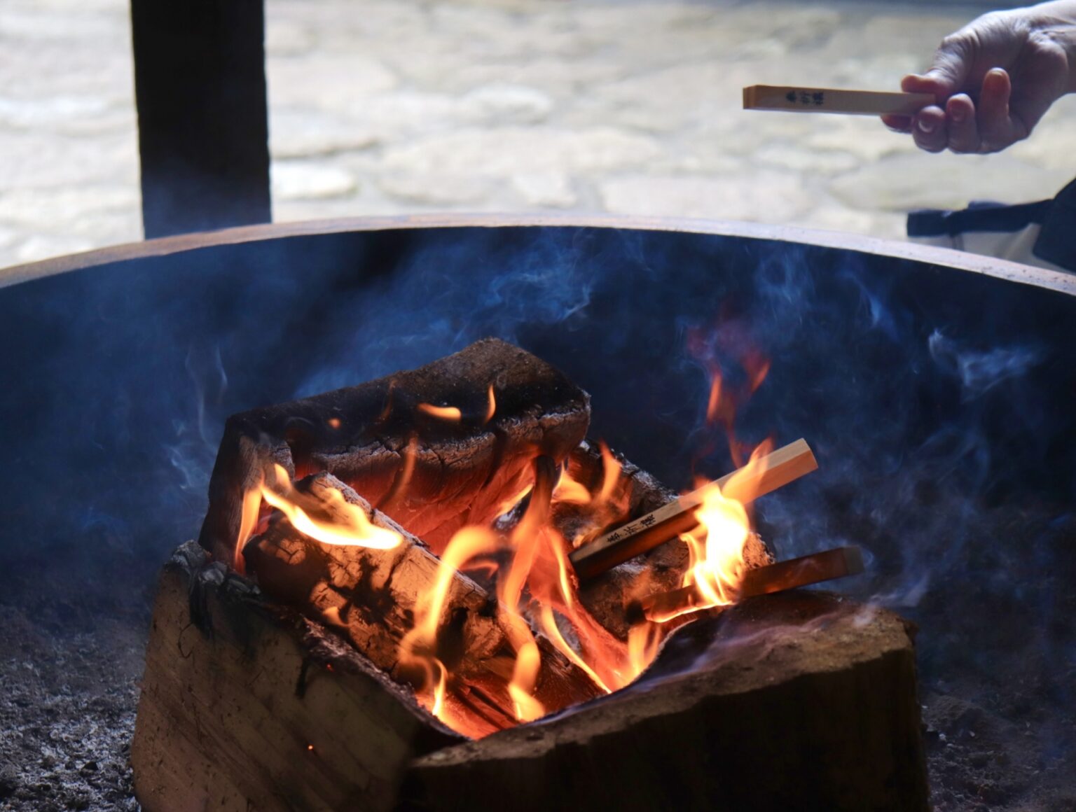 ある人が護摩壇の前でじっと瞑想している