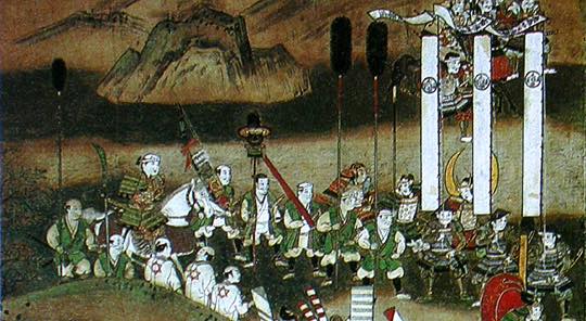 この紋章が入った半纏を着た人物たちが周囲を囲んでいる、ということが権力者として、何か特別な意味があるのであろうか?