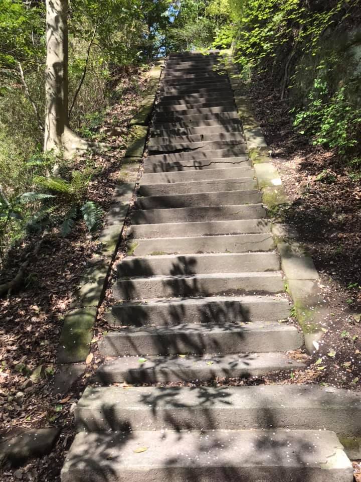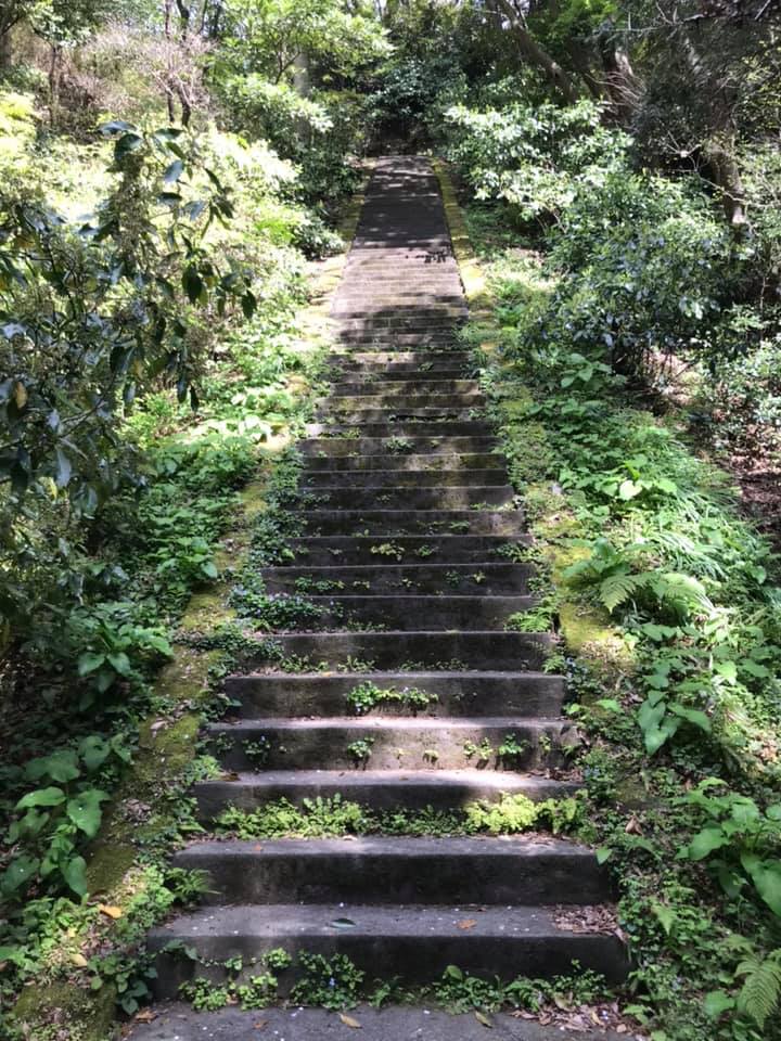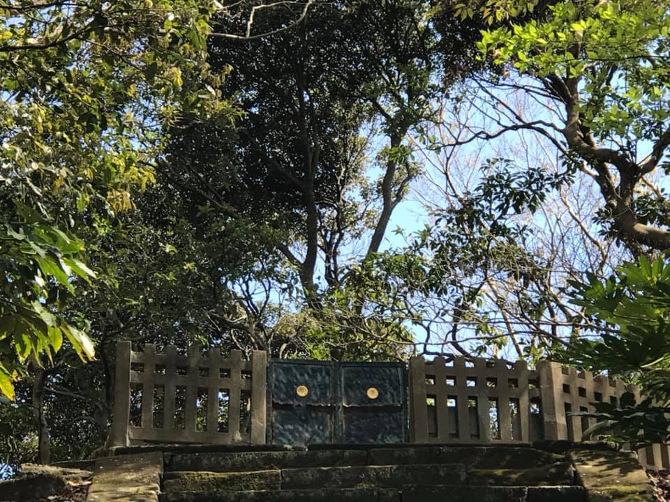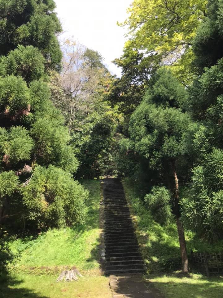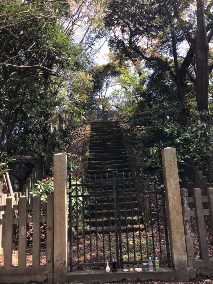 長い石段が二つ続き、さらに中程度の石段、さらに短い石段のその上に墳墓があるが最期の石段は登れない。
