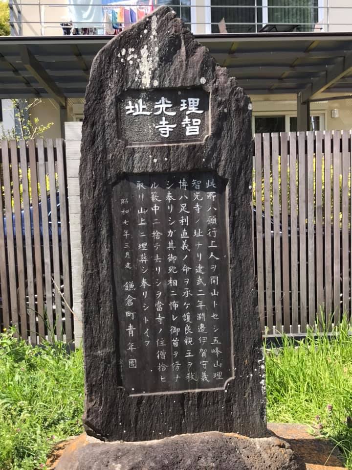 「ここは元、理智光寺の跡である。建武二年、伊賀守義博は足利直義の命をうけて護良親王を誅したが、その生首の表情があまりに恐ろしい形相であったので恐れをなしてその首をこの辺りの藪中に捨て去った。その後寺の僧侶がこれを拾い山上に葬った」