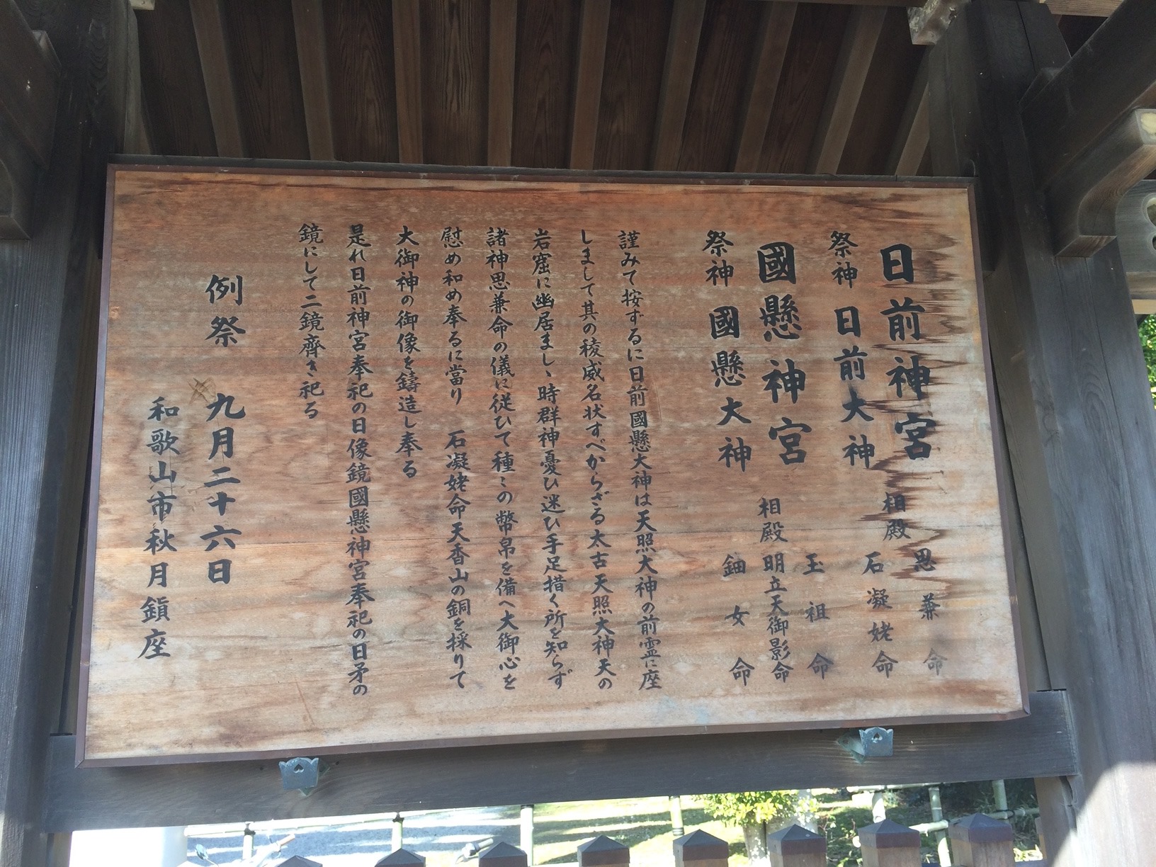 『謹みて按するに日前大神國懸大神は 天照陽之大神の前霊に座しまして 其の稜威名状すべからざるなり 太古 天照大神の天の岩窟に幽居ましし時 群神憂ひ迷い手足掻くところを知らす 諸神 思兼神の議に従いて種々の幣帛(へいはく-神前の供物)を備え 大御心を慰め和わし奉るに當て 石凝姥命(イシゴリドメ) 天香山の銅を採りて大御神の御像を鋳造し奉る』