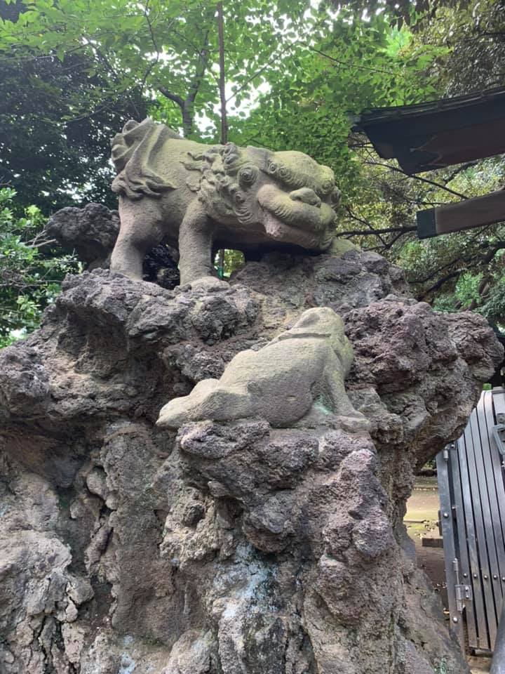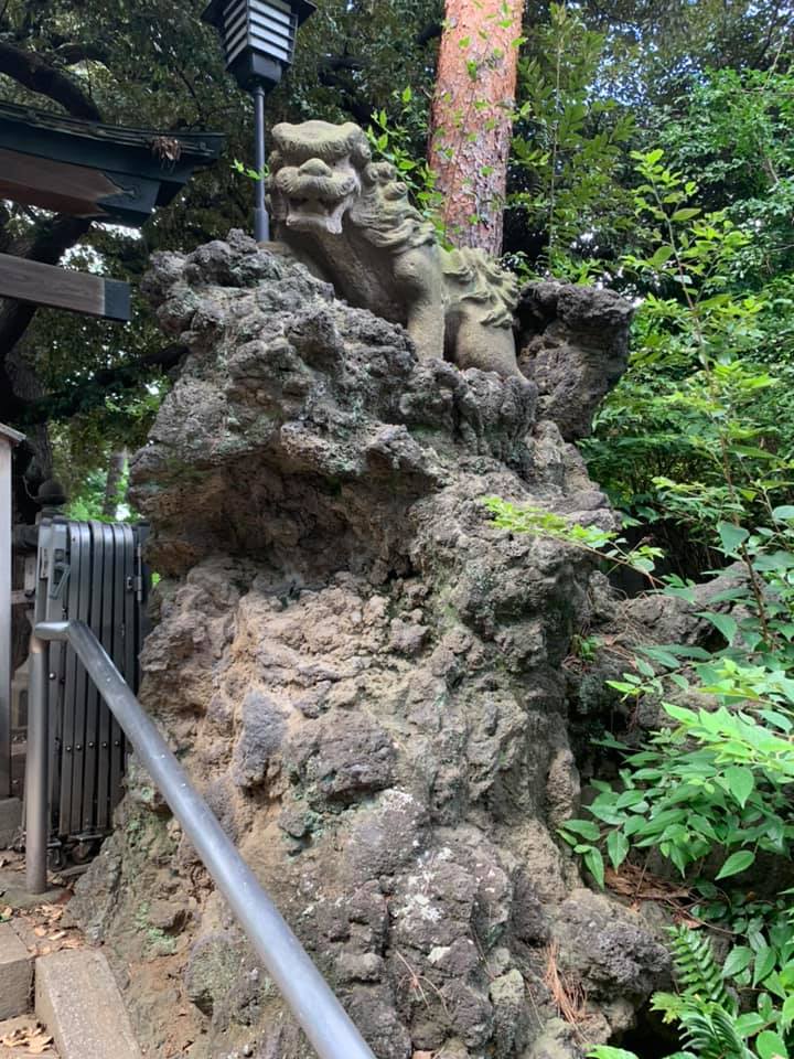 岩の築山の上に佇む狛犬と中央に配置された木製の鳥居のバランスが非常に美しい。
