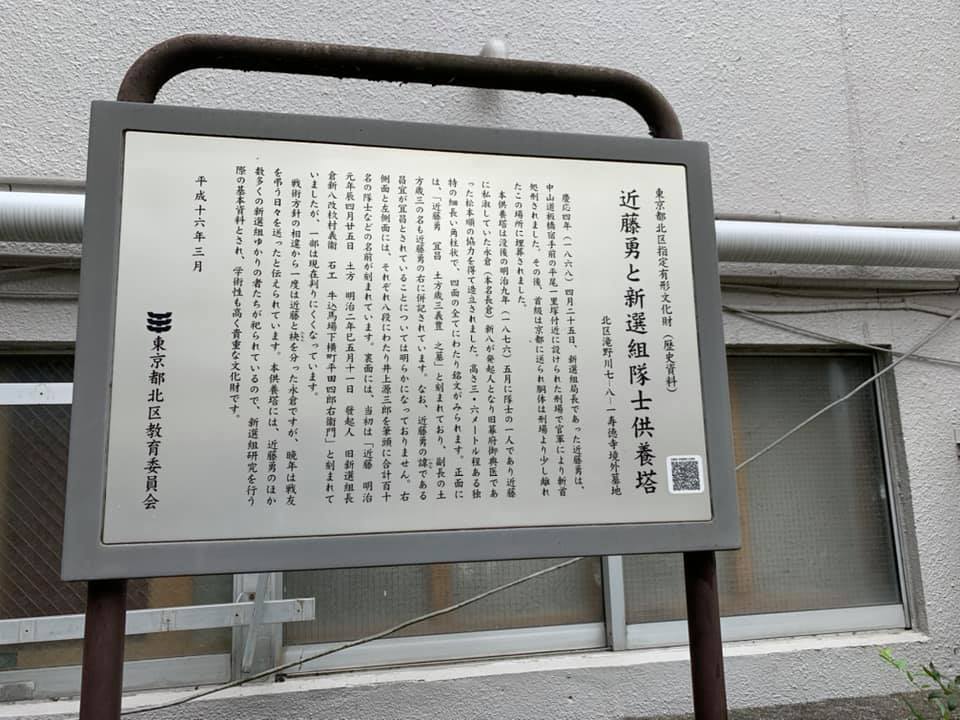 Share Facebook Twitter LinkedIn Pinterest Email JR板橋駅正面に 「近藤勇 土方歳三 之 墓」 という大きな墓標の前を通りかかった。 どうやらこの付近にあった刑場で斬首され、胴体がこnの地に埋葬されたようだ。 土方歳三の名もあるが、ここに埋葬されたかどうかの記載はない。 この地に墓標を建立することに尽力した永倉新八の墓標が正面横に建っている。 般若心経一巻 合掌 近藤勇 胴塚 板橋近藤勇 胴塚 板橋近藤勇 胴塚 板橋近藤勇 胴塚 板橋