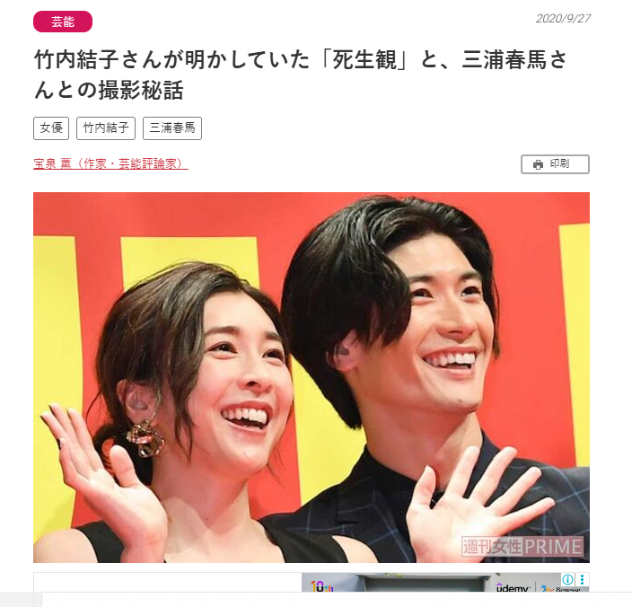 竹内結子さんが明かしていた「死生観」と、三浦春馬さんとの撮影秘話(週刊女性PRIME)