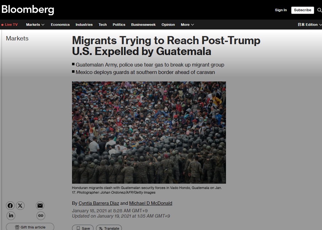 Share Facebook Twitter LinkedIn Pinterest Email バイデン政権に期待して人が殺到しつつある。 https://www.bloomberg.com/news/articles/2021-01-17/thousands-of-migrants-head-for-u-s-after-clash-in-guatemala