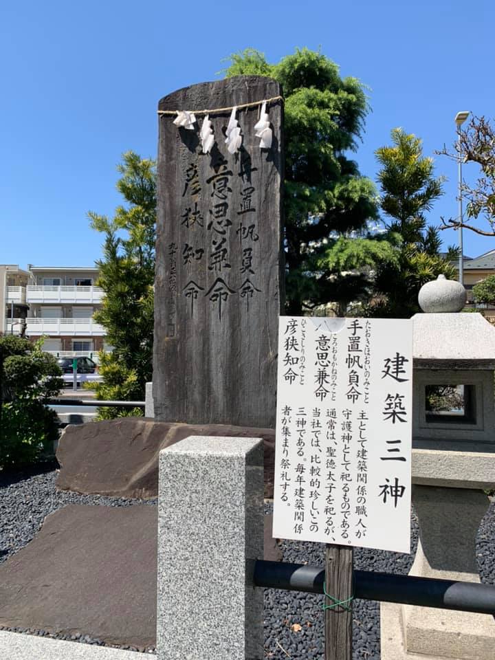 境内にはいくつかの摂社があるが、建築関係の職人がお祀りする「建築三神」の碑があり今でも毎年建築関係者が碑の前で祭礼を行うという。