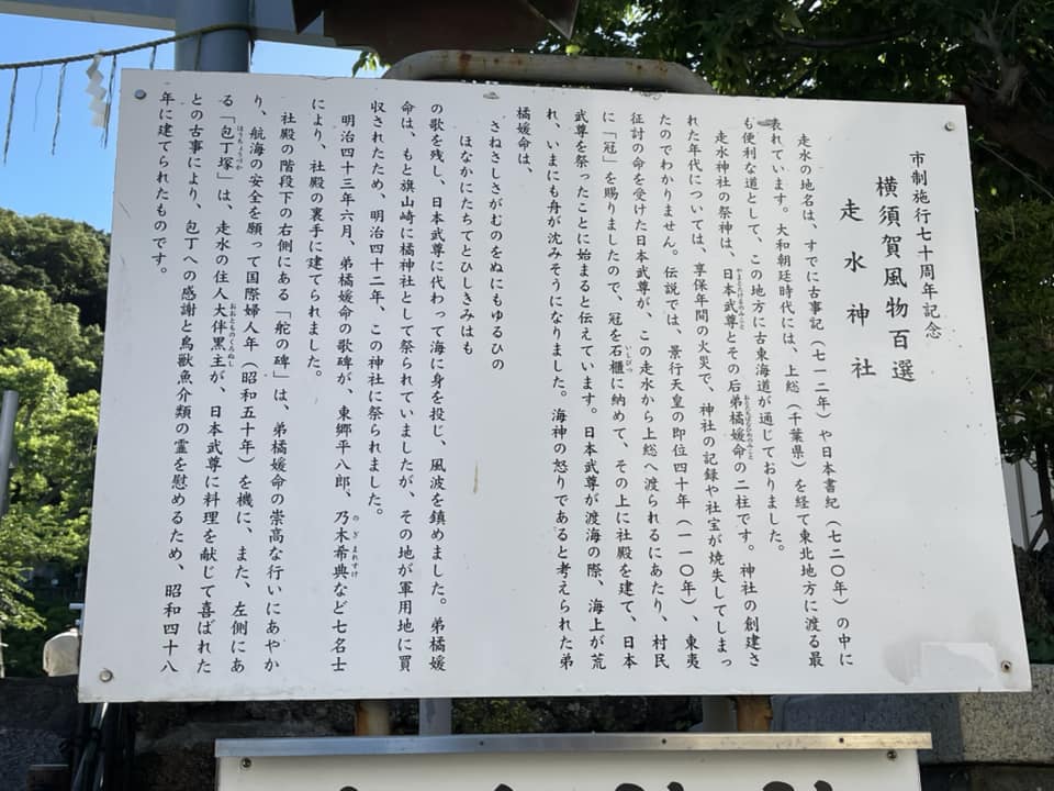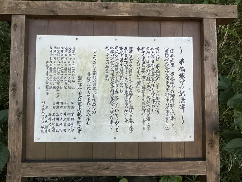 また、東郷平八郎が発起人として、乃木希典、伊東祐亨、上村彦之丞らが集い、竹田宮昌子内親王御親筆になる弟橘媛の碑がある。