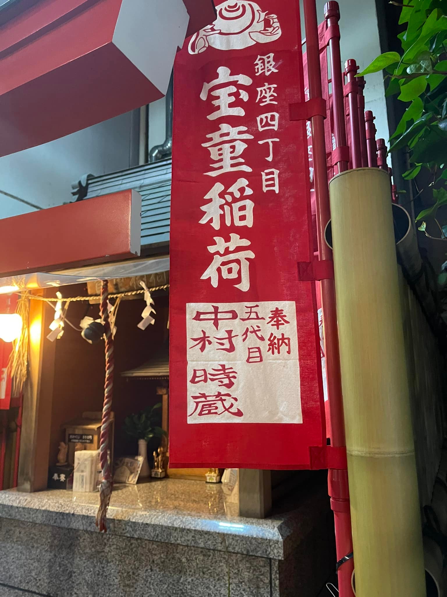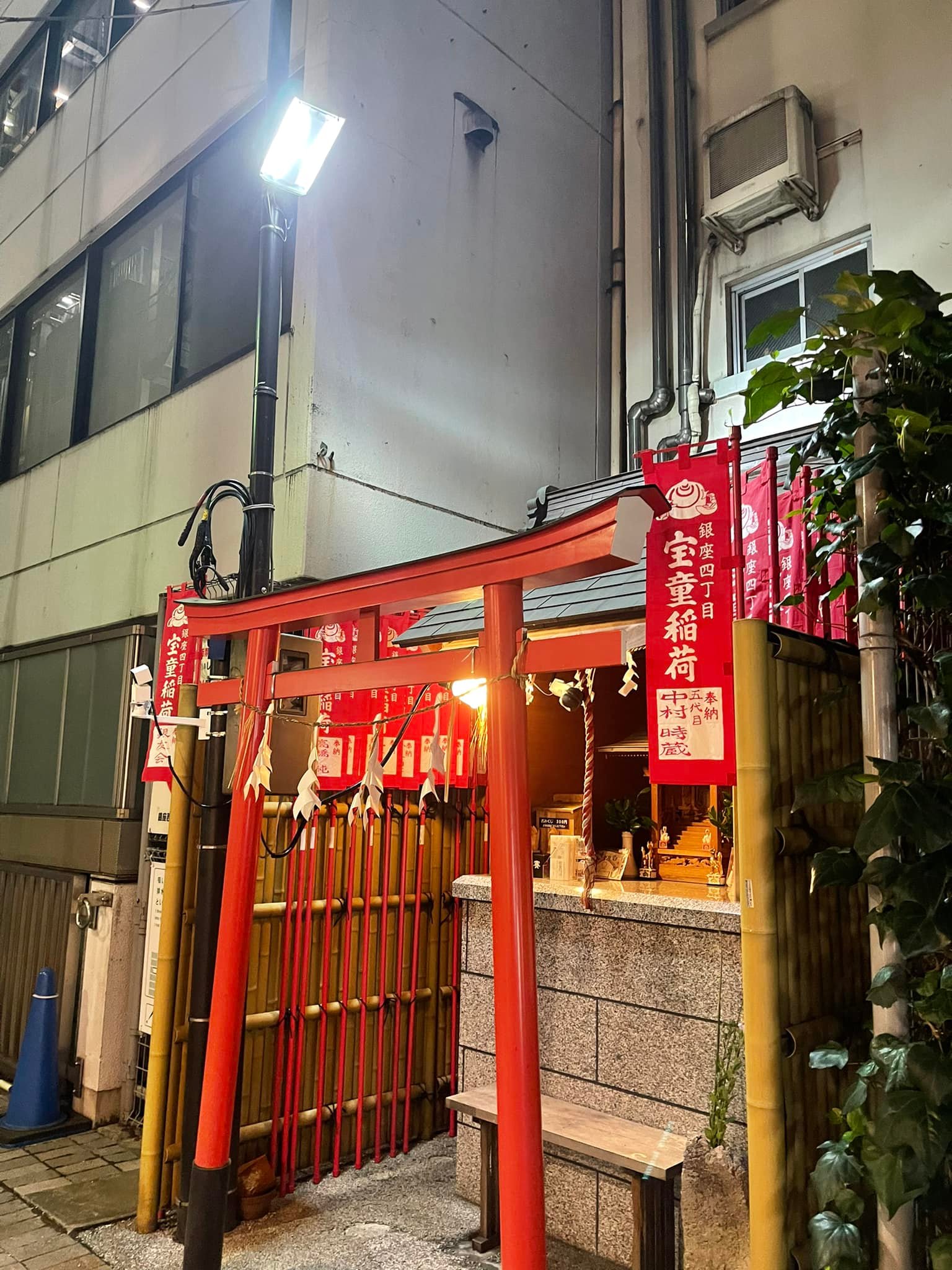 Share Facebook Twitter LinkedIn Pinterest Email 江戸時代の稲荷ブームで建立された神社のようだ。子育の神様という。 銀座の裏通りにはこのような小さな神社が幾つも発見できる。そういう神社の発見を楽しみに銀座を歩くのも良い。 銀座周辺の神社には歌舞伎役者が参拝することも多いようだが、この神社には「五代目 中村時蔵」の幟がある。 夜の銀座に佇む稲荷 宝童稲荷神社夜の銀座に佇む稲荷 宝童稲荷神社