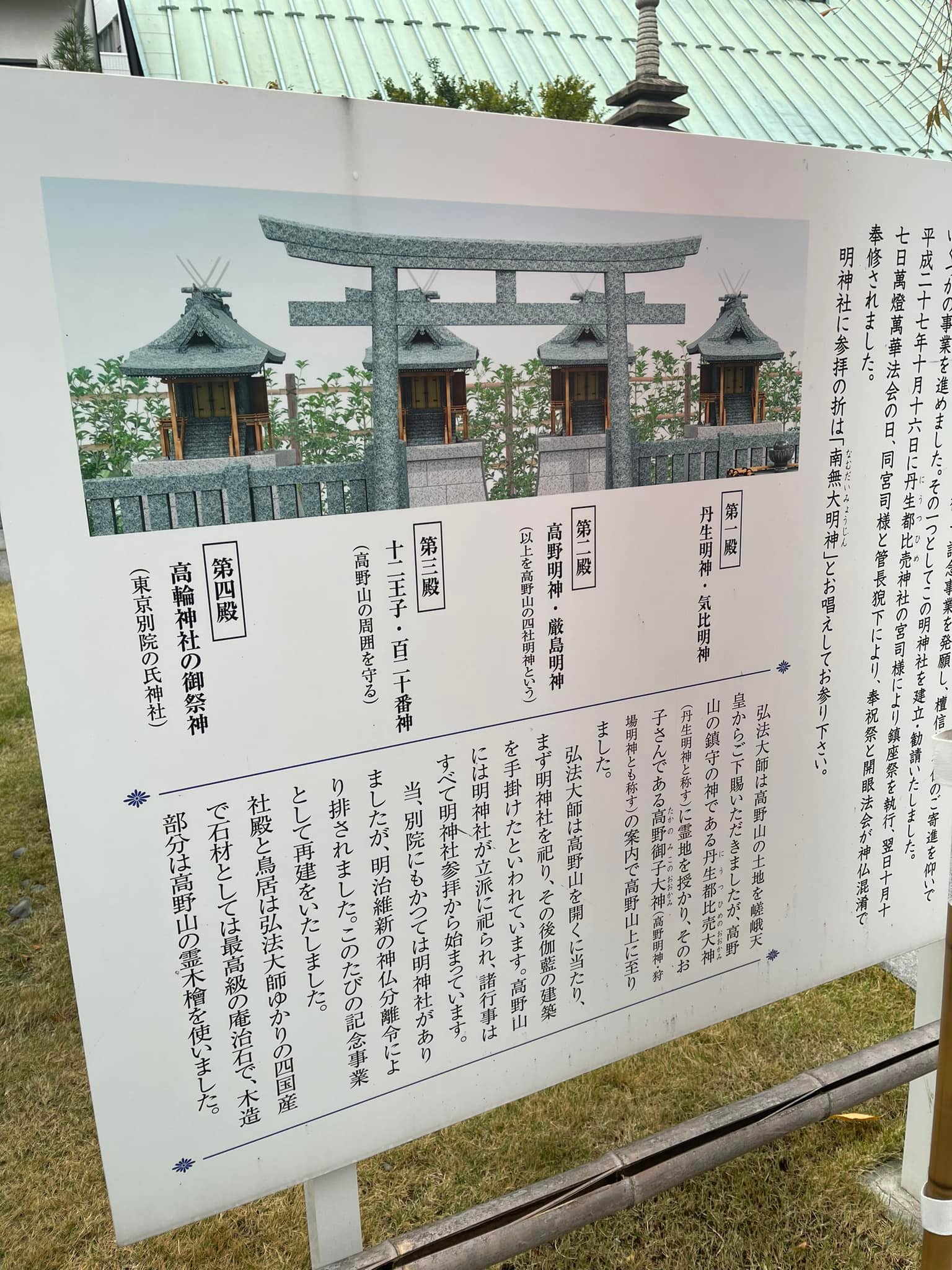 Share Facebook Twitter LinkedIn Pinterest Email 由緒によると、嵯峨天皇より高野山を下賜された後、高野山の守護神丹生都比売大神より霊地を授けられ、大神の子である高野御子大神(高野明神、狩場明神とも)に案内されて高野山山頂に至ったという。 空海はまず明神社を祀り、建立した後伽藍の建築を始めた。以降当山の行事は全て明神社から始まるという。 関東別院の明神社は、明治維新の神仏分離令で廃止されていたが平成二十七年、丹生都比売神社による鎮座祭が行われこの地に再興されたという。 品川 高野山関東別院 明神社