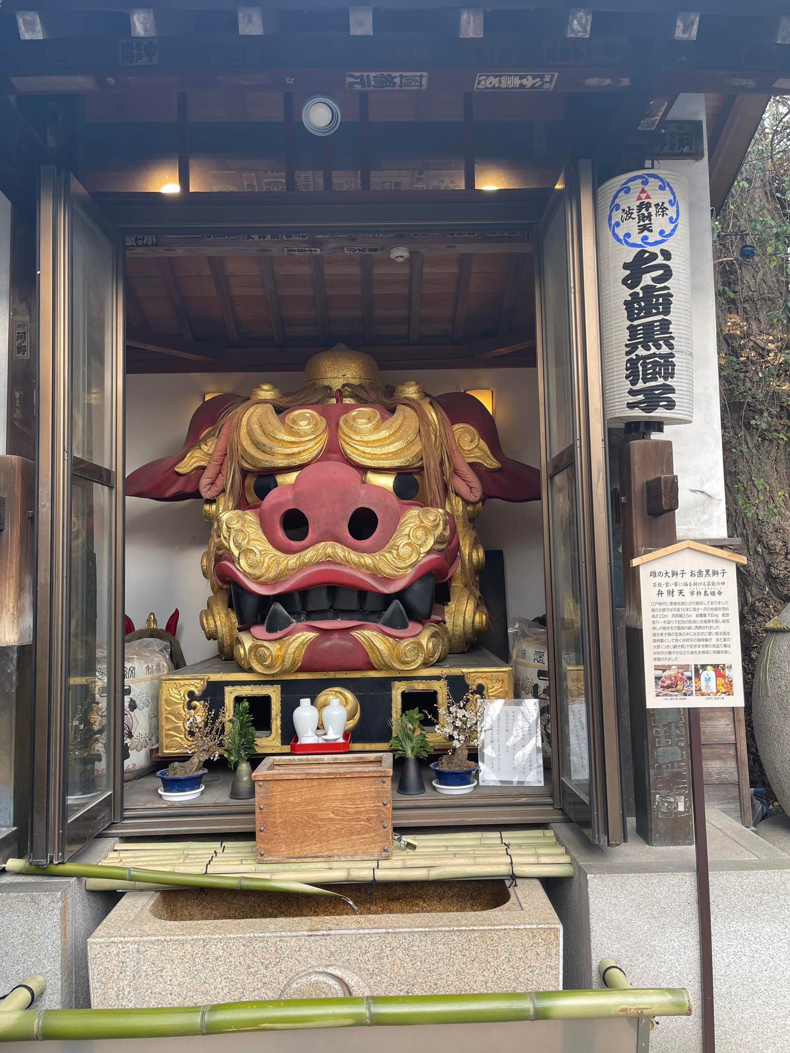 境内には日本最大の獅子頭(雄)と雌の獅子頭が奉安されており威容を放つ。雌の獅子頭は「お歯黒」のように歯が黒い。
