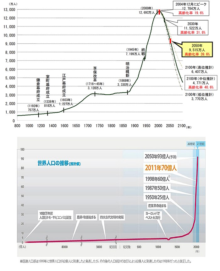 写真上が日本の人口推移のグラフだが世界の中で日本が先行しているに過ぎない。