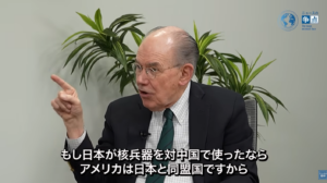 「日本が核武装することは米国の不利益だ。なぜなら日本が核を保有していて中国やロシアと戦争になった場合、日本は核を使用する可能性が出る。そうなると同盟国である米国へも核ミサイルが飛んでくる確率が高まる。それは避けたい。」
